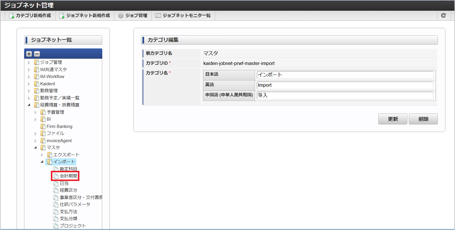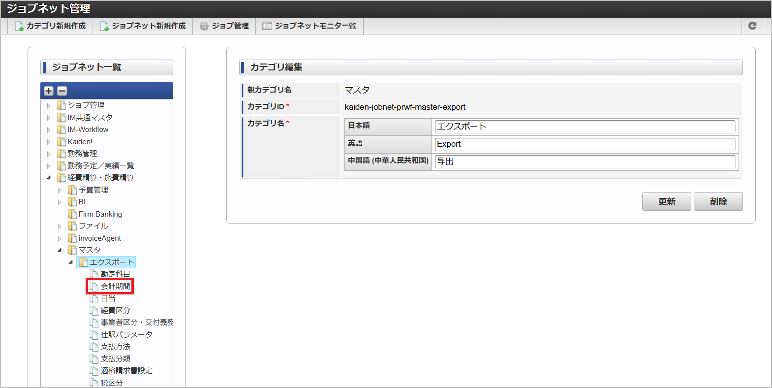 ジョブID ジョブ名(ジョブ選択時のツリー) kaiden-job-master-export-accountingperiod 経費旅費・旅費精算 / マスタ / エクスポート / 会計期間 編集後、「更新」をクリックします。 確認ポップアップの「決定」をクリックします。 ジョブネットが設定されました。