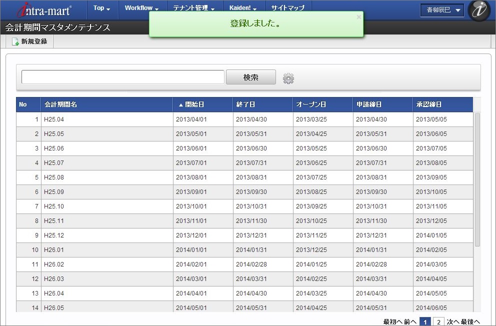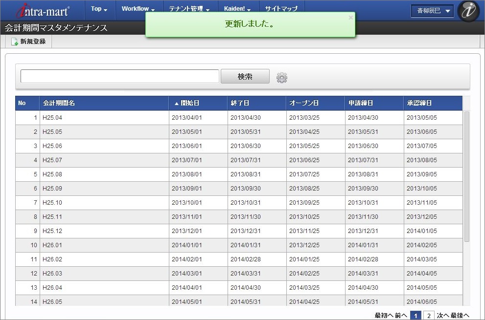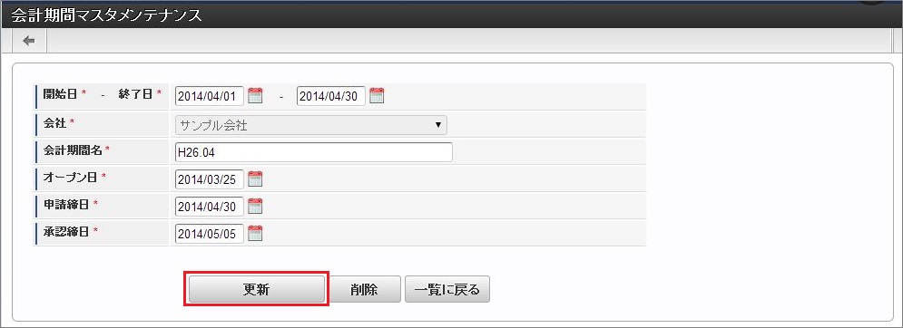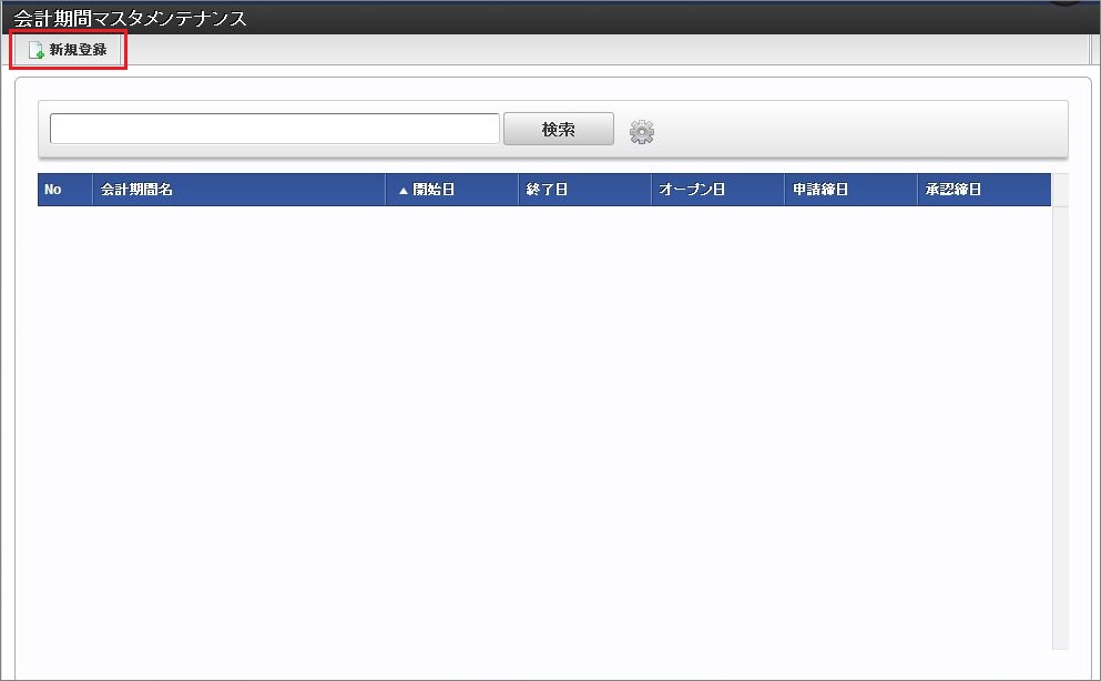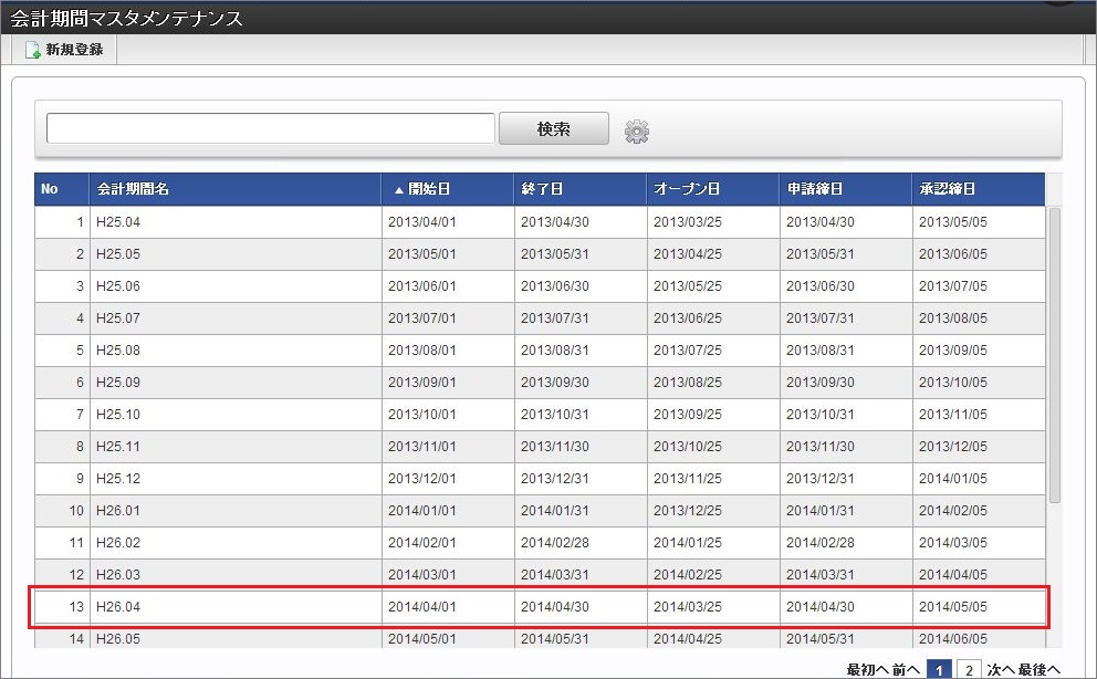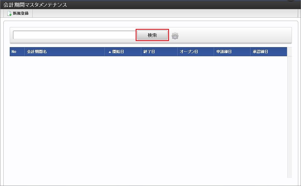 「サイトマップ」→「経費精算・旅費精算」→「マスタメンテナンス」→「会計期間」をクリックします。 一覧画面で「検索」をクリックします。コラム