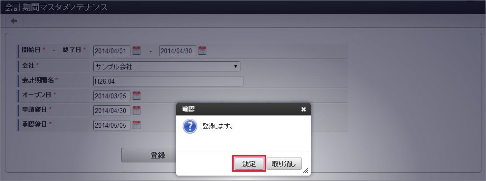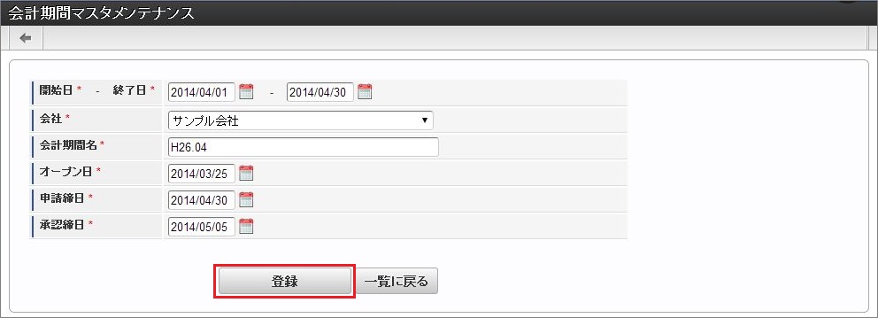 項目 項目名 備考 companyCd 会社コード accountingPeriodName 会計期間名 startDate 開始日 yyyy/MM/dd形式 endDate 終了日 yyyy/MM/dd形式 openingDate オープン日 yyyy/MM/dd形式 applyClosingDate 申請締日 yyyy/MM/dd形式 approvalClosingDate 承認締日 yyyy/MM/dd形式