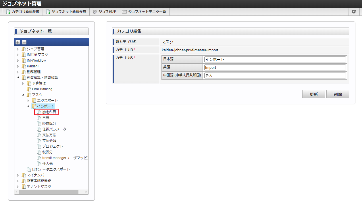 ジョブID ジョブ名(ジョブ選択時のツリー) kaiden-job-master-import-account 経費旅費・旅費精算 / マスタ / インポート / 勘定科目 編集後、「更新」をクリックします。 確認ポップアップの「決定」をクリックします。 ジョブネットが設定されました。コラム