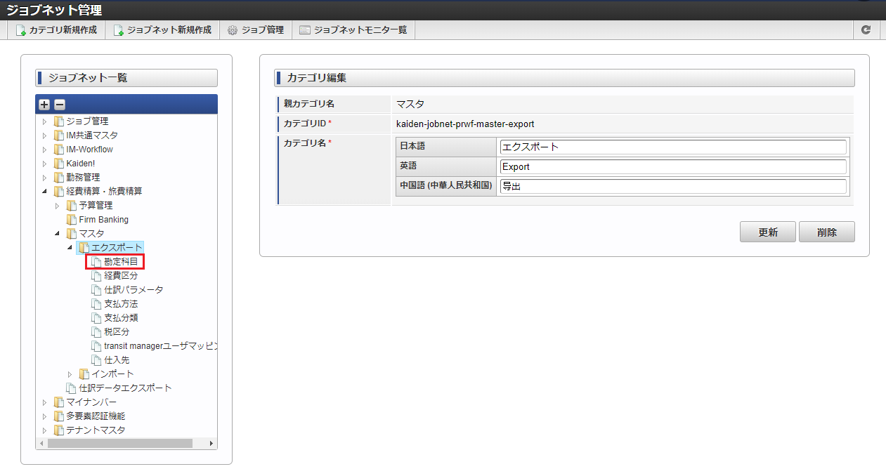 ジョブID ジョブ名(ジョブ選択時のツリー) kaiden-job-master-export-account 経費旅費・旅費精算 / マスタ / エクスポート / 勘定科目 編集後、「更新」をクリックします。 確認ポップアップの「決定」をクリックします。 ジョブネットが設定されました。