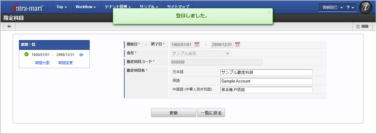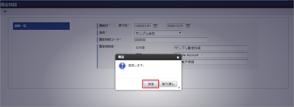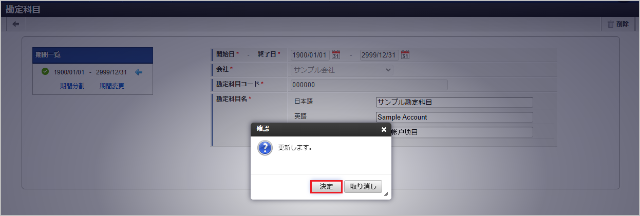 期間機能の操作方法は、 期間の操作 を参照してください。 確認ポップアップが表示されますので、「決定」をクリックします。 更新することができました。