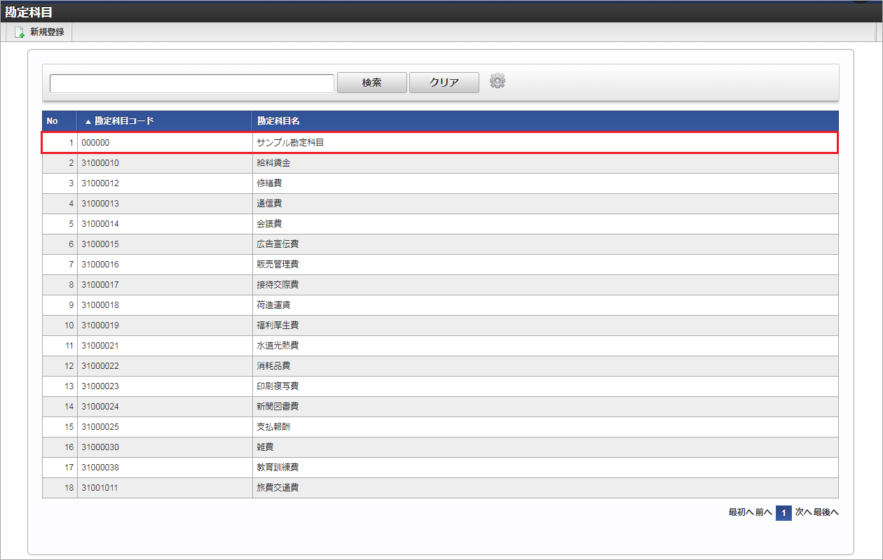 勘定科目コード 勘定科目名 一覧画面の対象データが表示されている行をクリックします。コラム