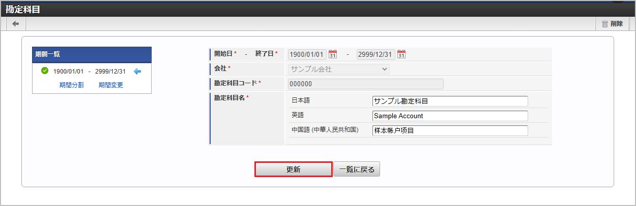項目 項目名 備考 companyCd 会社コード accountCd 勘定科目コード localeId ロケール ja:日本語en:英語zh_CN:中国語startDate 開始日 yyyy/MM/dd形式 endDate 終了日 yyyy/MM/dd形式 accountName 勘定科目名 deleteFlag 削除フラグ 0:有効1:無効