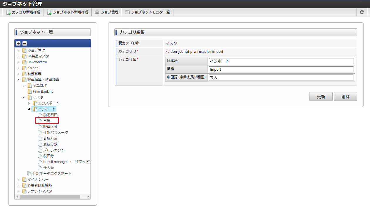 ジョブID ジョブ名(ジョブ選択時のツリー) kaiden-job-master-import-allowance 経費精算・旅費精算 / マスタ / インポート / 日当 編集後、「更新」をクリックします。 確認ポップアップの「決定」をクリックします。 ジョブネットが設定されました。コラム