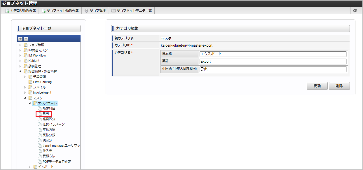 ジョブID ジョブ名(ジョブ選択時のツリー) kaiden-job-master-export-allowance 経費精算・旅費精算 / マスタ / エクスポート / 日当 編集後、「更新」をクリックします。 確認ポップアップの「決定」をクリックします。 ジョブネットが設定されました。