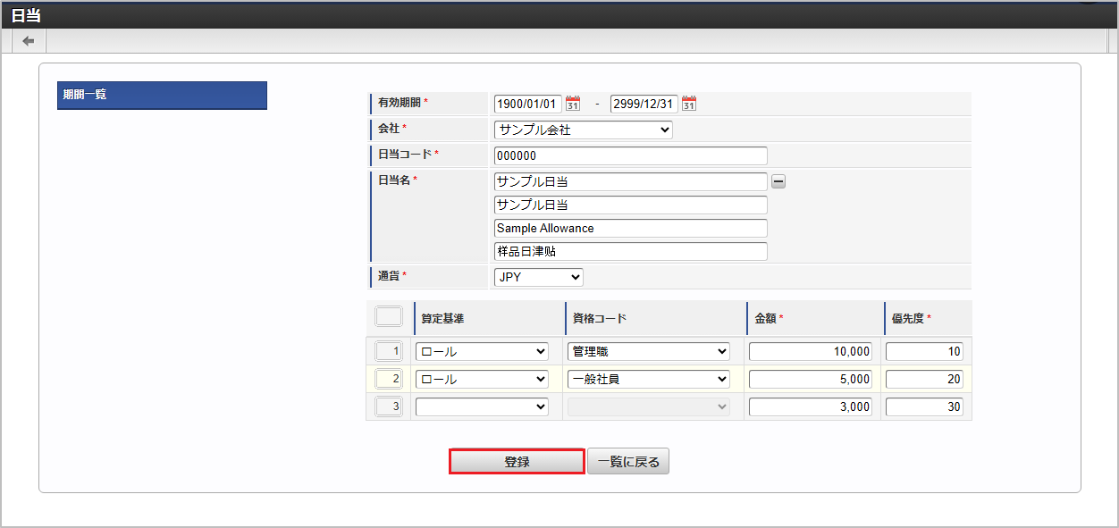 日当コード会社ごとに一意のコードを入力します。 日当名日当の名称を入力します。 通貨通貨を選択します。 算定基準「ロール」または「役職」を選択します。空欄の指定も可能です。 資格コード算定基準に「ロール」を指定した場合、ロールがリストされますので選択します。算定基準に「役職」を指定した場合、役職がリストされますので選択します。算定基準を指定しない場合は入力不可です。 金額金額を入力します。 優先度優先度を入力します。数字が小さいほど優先度が高く設定されます。コラム
