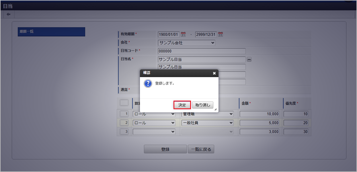 明細行の操作方法は、 明細行の操作 を参照してください。 確認ポップアップが表示されますので、「決定」をクリックします。 新規登録することができました。