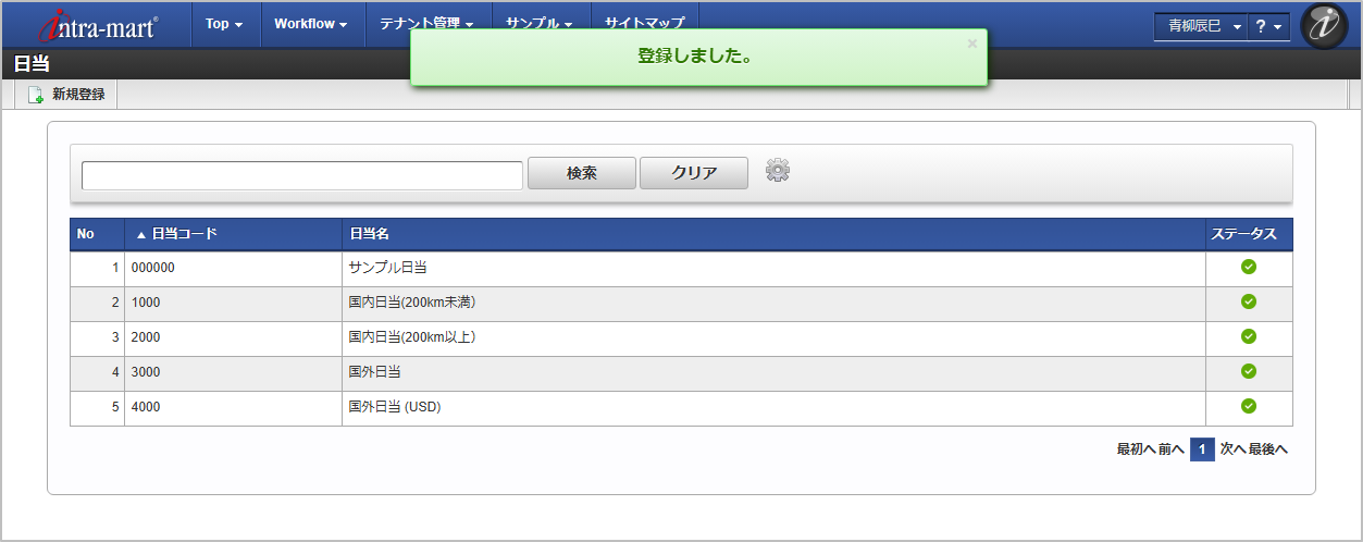 「サイトマップ」→「経費精算・旅費精算」→「マスタメンテナンス」→「日当」をクリックします。 一覧画面表示後、「新規登録」をクリックします。 登録/更新画面で必要な情報を入力し、「登録」をクリックします。