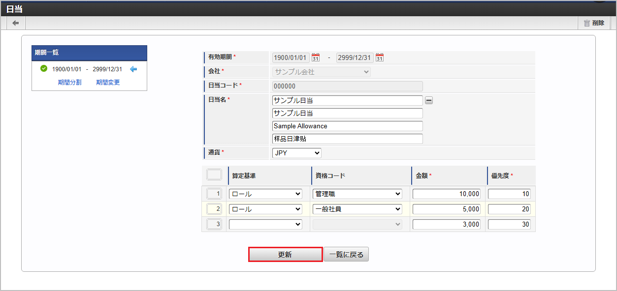 複数のロケールで利用する場合は、必要な全ロケール分のデータを作成してください。データサンプル"comp_sample_01","000000","term01","ja","1900/01/01","1999/12/31","サンプル日当","JPY","1" "comp_sample_01","000000","term01","en","1900/01/01","1999/12/31","Sample Allowance","JPY","1" "comp_sample_01","000000","term01","zh_CN","1900/01/01","1999/12/31","样品日补贴","JPY","1" "comp_sample_01","000000","term02","ja","2000/01/01","2999/12/31","サンプル日当","JPY","0" "comp_sample_01","000000","term02","en","2000/01/01","2999/12/31","Sample Allowance","JPY","0" "comp_sample_01","000000","term02","zh_CN","2000/01/01","2999/12/31","样品日补贴","JPY","0"コラム