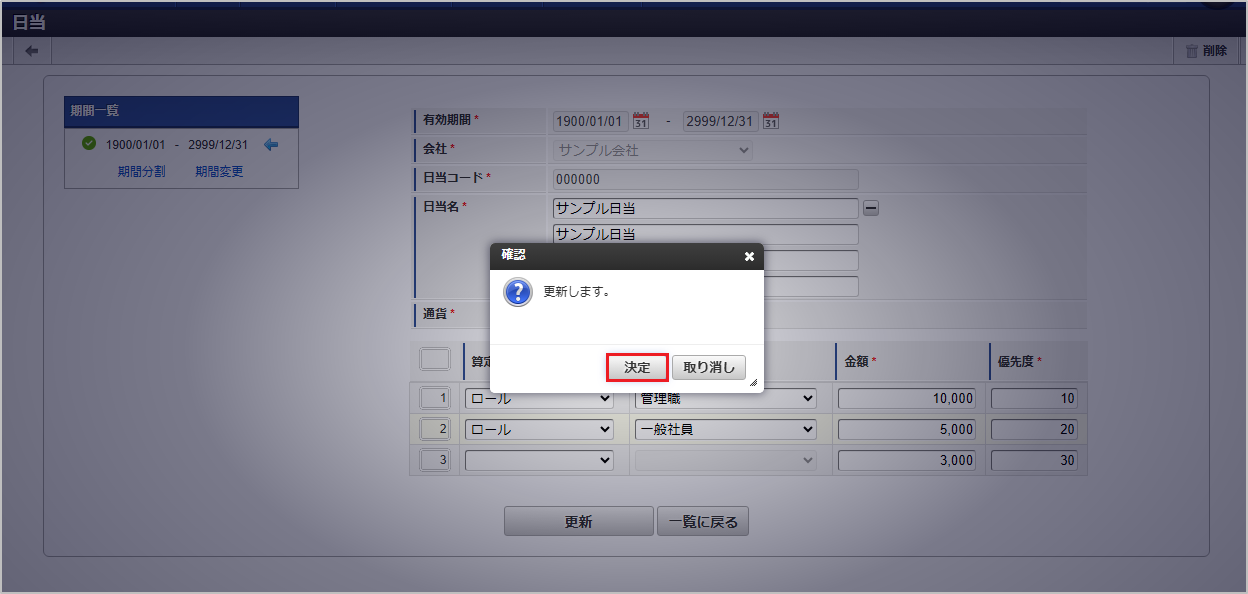 期間機能の操作方法は、 期間の操作 を参照してください。 確認ポップアップが表示されますので、「決定」をクリックします。 更新することができました。