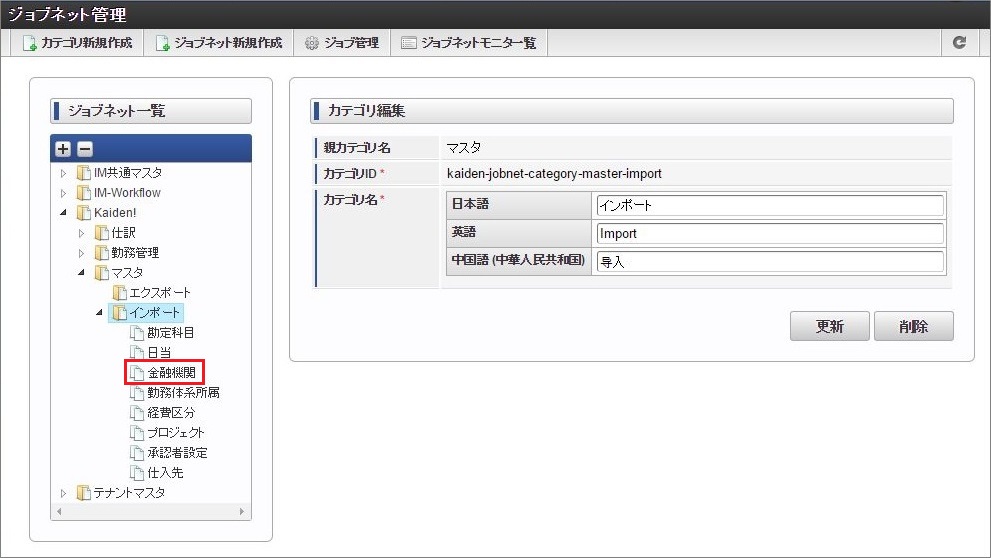 ジョブID ジョブ名(ジョブ選択時のツリー) kaiden-job-master-import-bankfaciljp Kaiden! / マスタ / インポート / 金融機関 編集後、「更新」をクリックします。 確認ポップアップの「決定」をクリックします。 ジョブネットが設定されました。コラム
