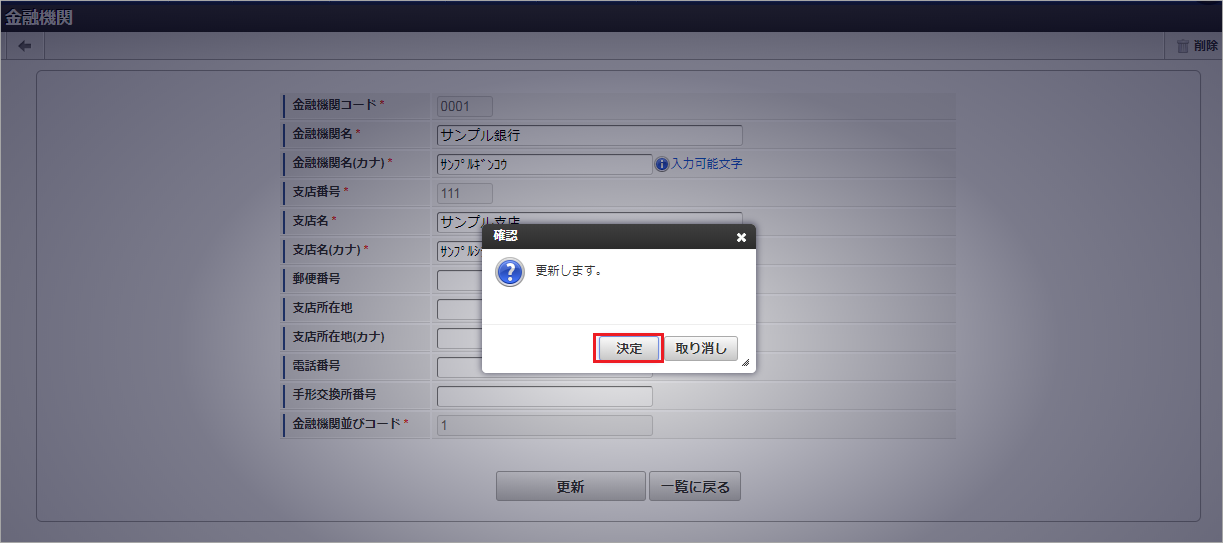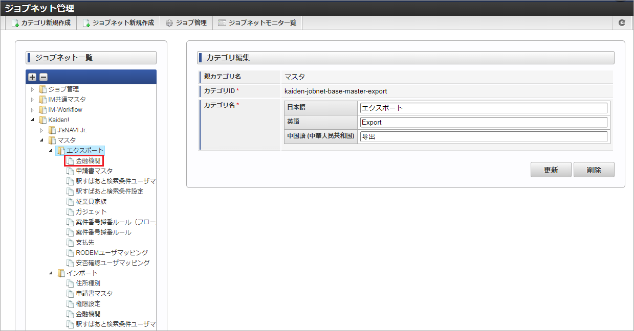 ジョブID ジョブ名(ジョブ選択時のツリー) kaiden-job-master-export-bankfaciljp Kaiden! / マスタ / エクスポート / 金融機関 編集後、「更新」をクリックします。 確認ポップアップの「決定」をクリックします。 ジョブネットが設定されました。