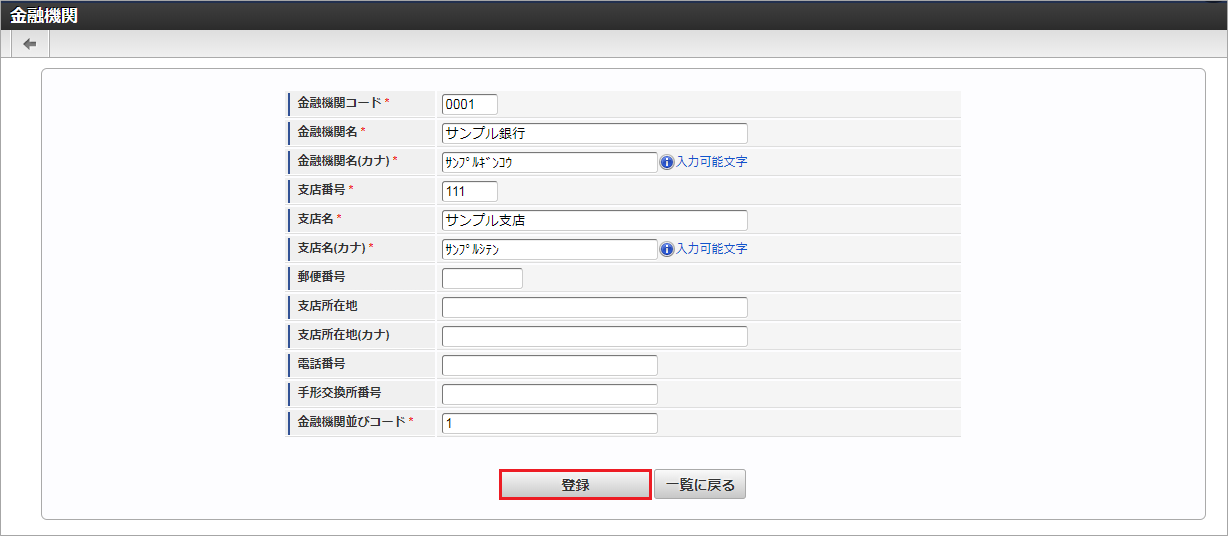 No(列) 項目名 必須 最大文字数 備考 1 金融機関コード ○ 4 2 金融機関名 ○ 250 3 金融機関名(カナ) ○ 15 4 支店番号 ○ 3 5 支店名 ○ 250 6 支店名(カナ) ○ 15 7 郵便番号 25 8 支店所在地 250 9 支店所在地(カナ) 250 10 電話番号 25 11 手形交換所番号 100 12 金融機関並びコード ○ 100 データサンプル"0001","サンプル銀行","サンプルギンコウ","005","本店","ホンテン","999-999","所在地","ショザイチ","100-000-111","","1"コラム