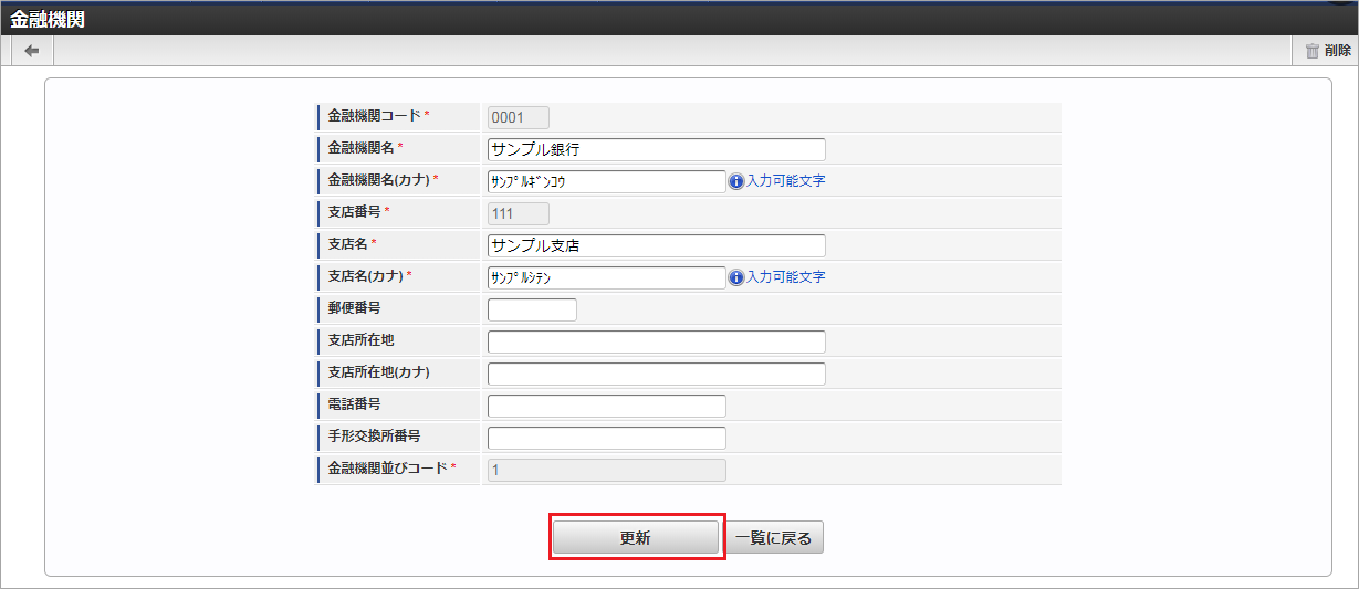 一覧機能の操作方法は、 一覧画面の操作 を参照してください。 登録/更新画面で情報を編集し、「更新」をクリックします。次の項目は編集不可項目です。