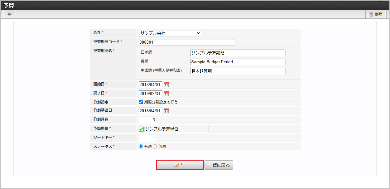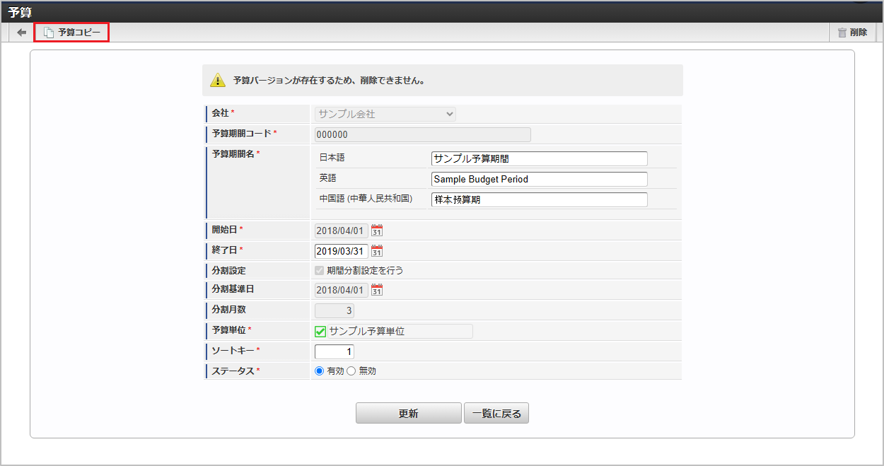 一覧機能の操作方法は、 一覧画面の操作 を参照してください。 登録/更新画面表示後、「予算コピー」をクリックします。 登録/更新画面で情報を編集し、「コピー」をクリックします。