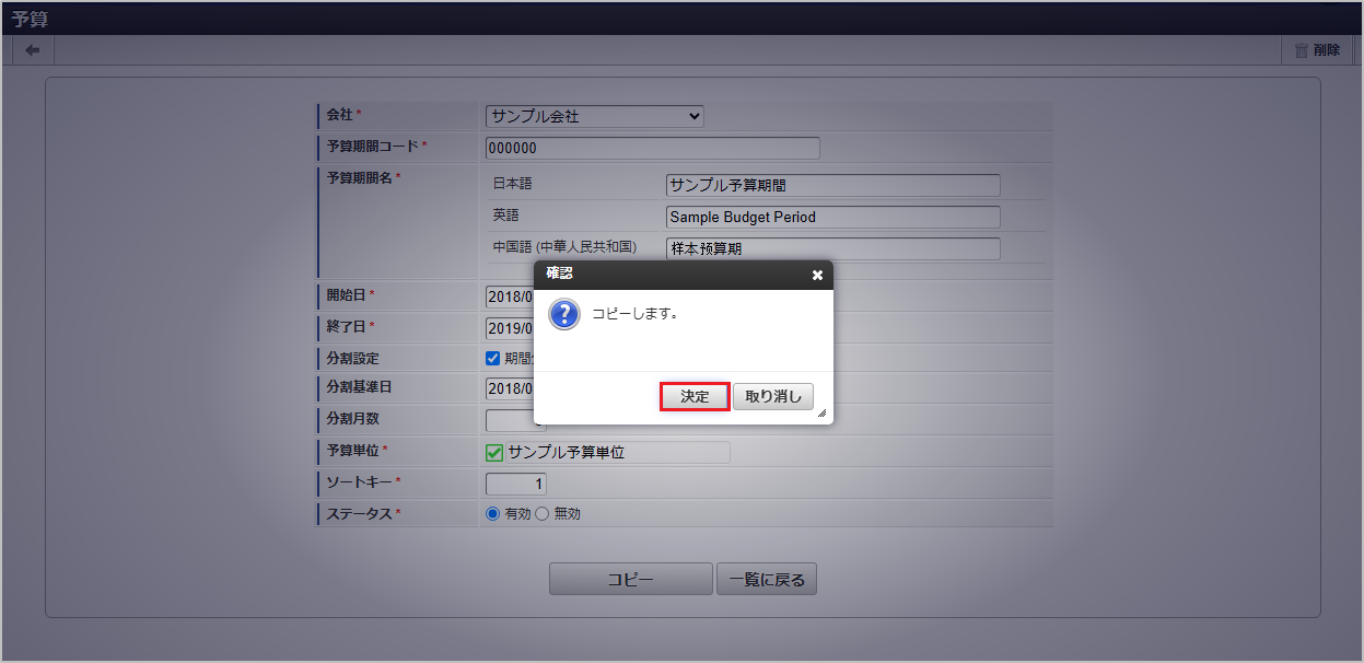 期間分割設定を行うチェックした場合は、予算明細画面で予算金額を分割した期間ごとに入力を可能とします。チェックをしていない場合は、予算明細画面で予算金額を単一期間で入力します。 分割基準日予算期間を分割する基準日を入力します。 分割月数予算期間を分割する月数を入力します。 予算単位予算で使用する予算単位を選択します。 確認ポップアップが表示されますので、「決定」をクリックします。 コピーすることができました。コラム