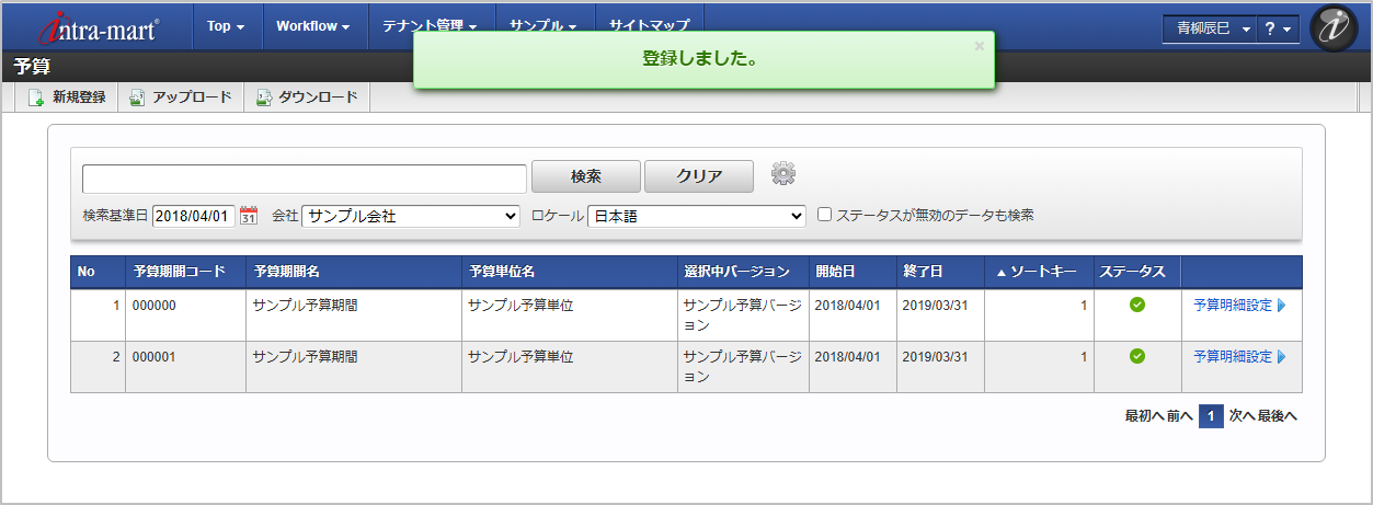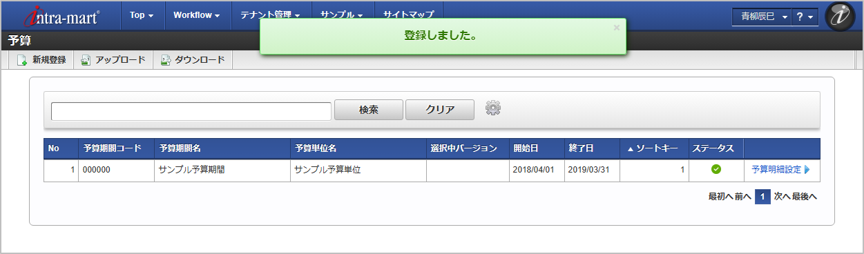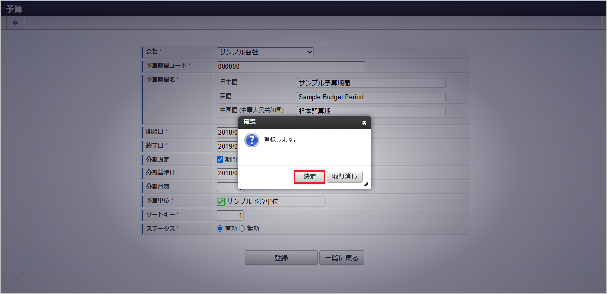 期間分割設定を行うチェックした場合、予算明細画面で予算金額を分割した期間ごとに入力します。また分割基準日、分割月数は必須となります。チェックしていない場合、予算明細画面で予算金額を単一期間で入力します。 分割基準日予算期間を分割する基準日を入力します。 分割月数予算期間を分割する月数を入力します。「1」の場合「1か月単位」で分割します。 予算単位予算で使用する予算単位を選択します。 確認ポップアップが表示されますので、「決定」をクリックします。 新規登録することができました。