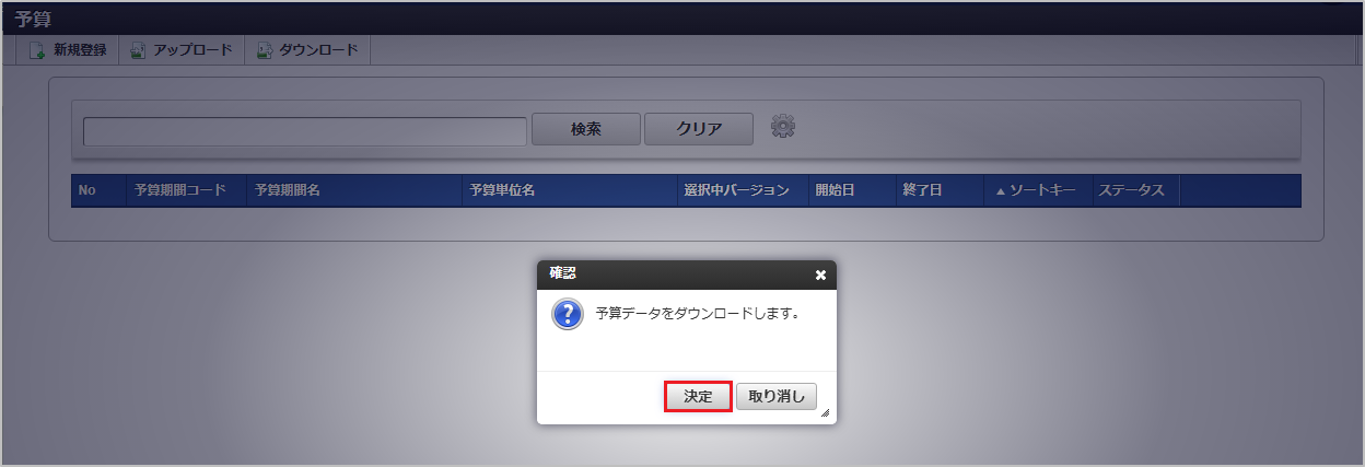 一覧機能の操作方法は、 一覧画面の操作 を参照してください。 一覧画面表示後、「ダウンロード」をクリックします。 確認ポップアップが表示されますので、「決定」をクリックします。 予算明細の情報がダウンロードされます。