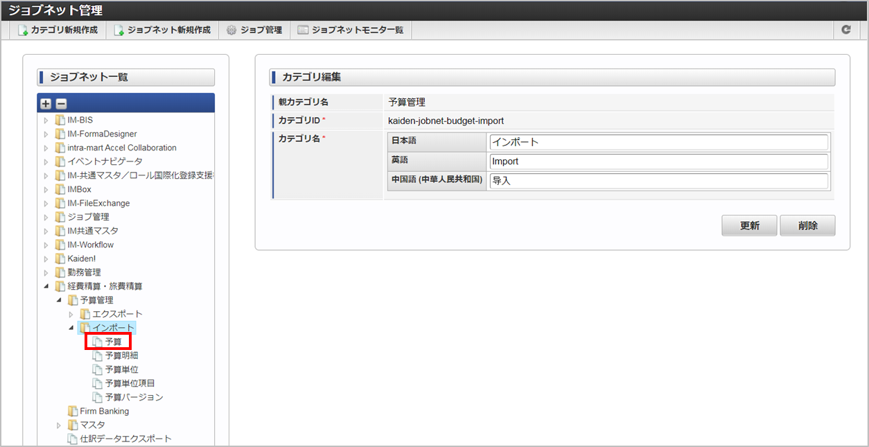 ジョブID ジョブ名(ジョブ選択時のツリー) kaiden-job-budget-import-budget 経費精算・旅費精算 / 予算管理 / インポート / 予算 編集後、「更新」をクリックします。 確認ポップアップの「決定」をクリックします。 ジョブネットが設定されました。コラム
