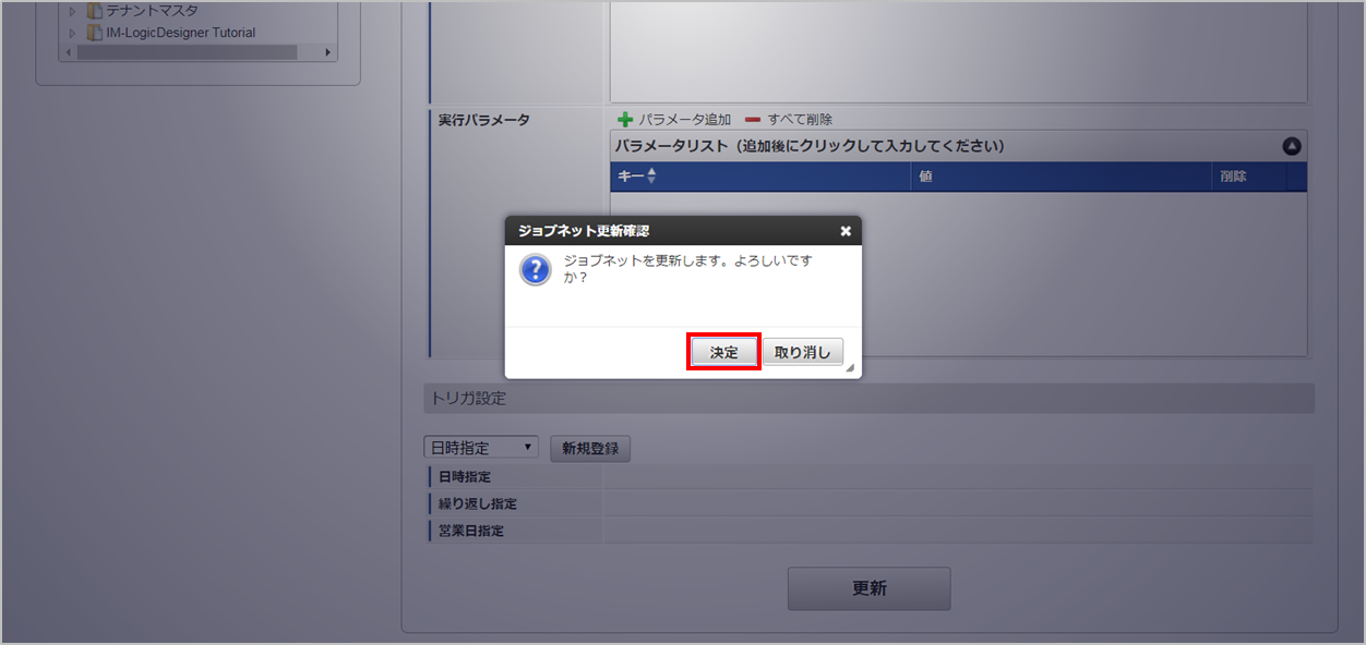 ジョブID ジョブ名(ジョブ選択時のツリー) kaiden-job-budget-export-budget 経費精算・旅費精算 / 予算管理 / エクスポート / 予算 編集後、「更新」をクリックします。 確認ポップアップの「決定」をクリックします。 ジョブネットが設定されました。