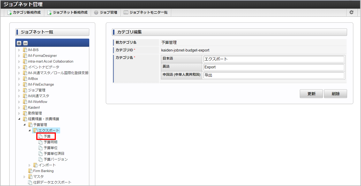 ジョブID ジョブ名(ジョブ選択時のツリー) kaiden-job-budget-export-budgetdetail 経費精算・旅費精算 / 予算管理 / エクスポート / 予算明細 編集後、「更新」をクリックします。 確認ポップアップの「決定」をクリックします。 ジョブネットが設定されました。