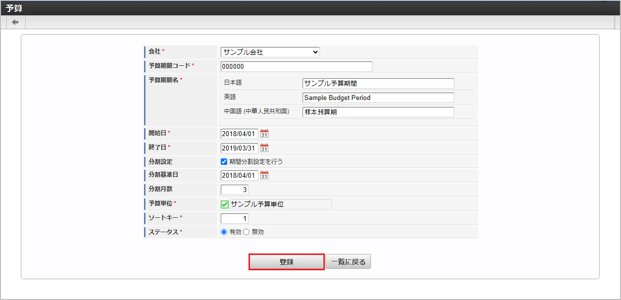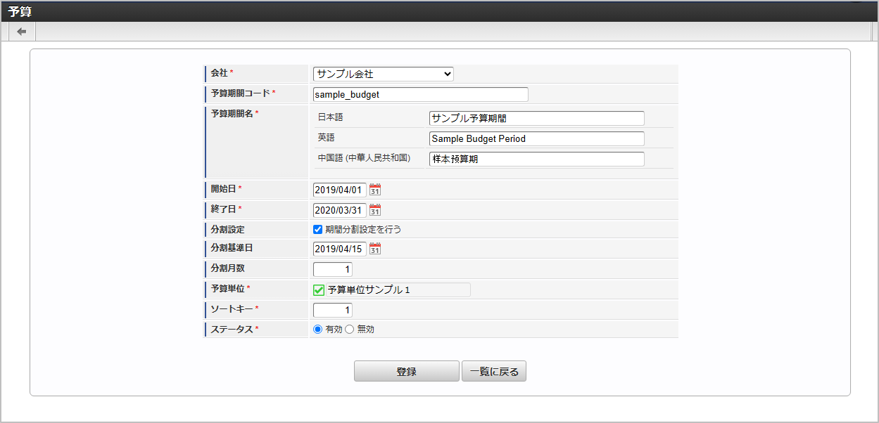 予算期間コード会社ごとに一意のコードを入力します。 予算期間名予算期間の名称を入力します。 開始日予算期間の開始日を入力します。 終了日予算期間の終了日を入力します。 分割設定予算期間を指定した月数で分割する場合、チェックします。