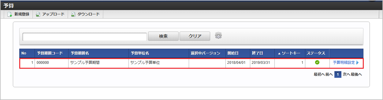 予算期間コード 予算期間名 一覧画面で対象データが表示されている行の「予算明細設定」をクリックします。コラム