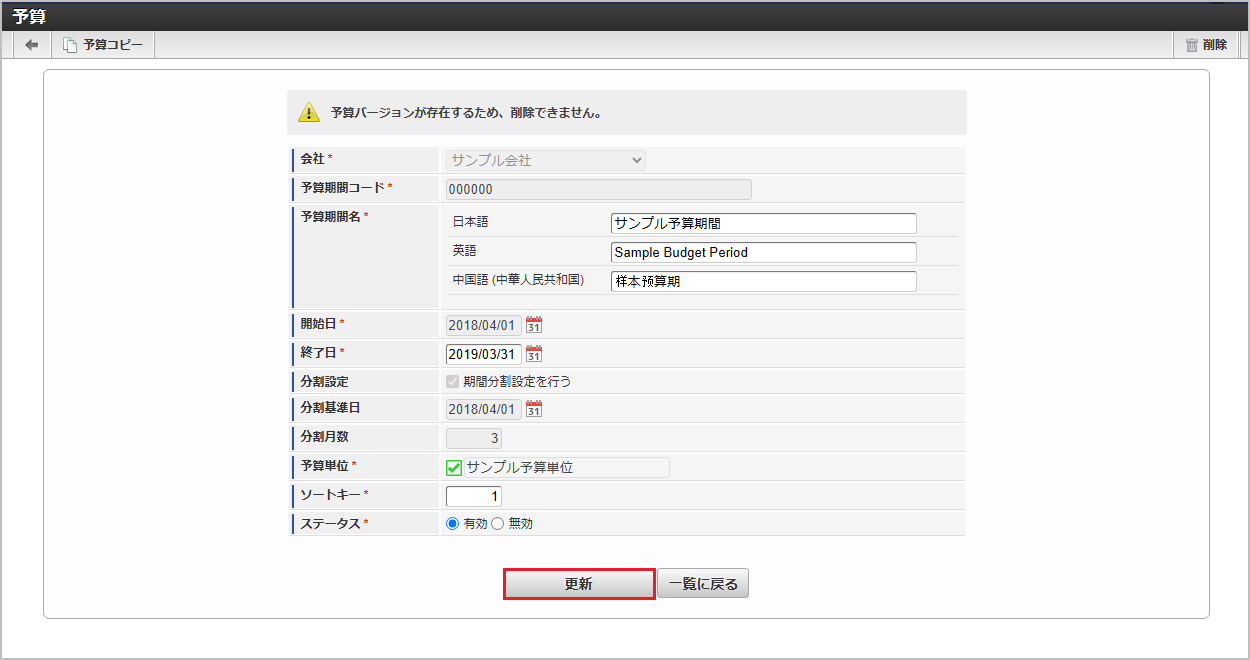 予算単位項目(予算マスタで設定した予算単位の項目) 予算金額 登録/更新画面で情報を編集し、「更新」をクリックします。次の項目は編集不可項目です。