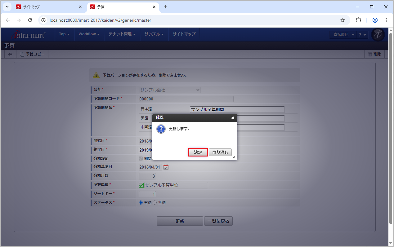 予算明細がすでに登録されている場合、開始日、分割設定、予算単位の編集および予算期間の削除が行えません。 確認ポップアップが表示されますので、「決定」をクリックします。 更新することができました。