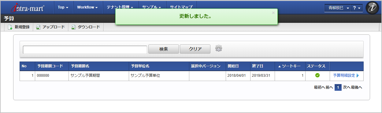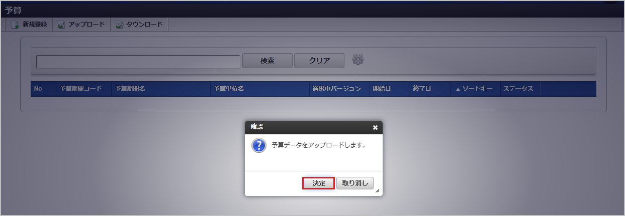 アップロードファイルの詳細は、インポートデータ作成を参照してください。 予算明細の情報が登録/更新されます。