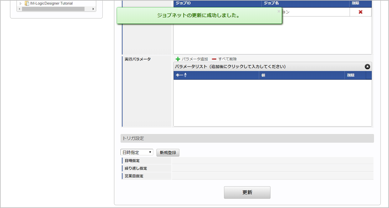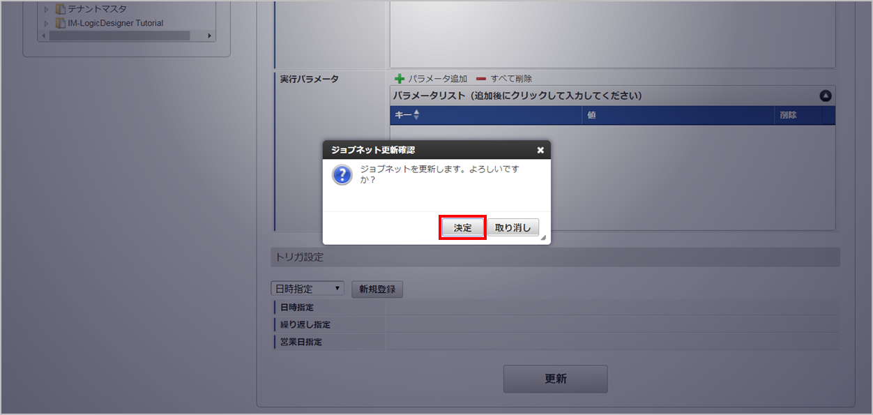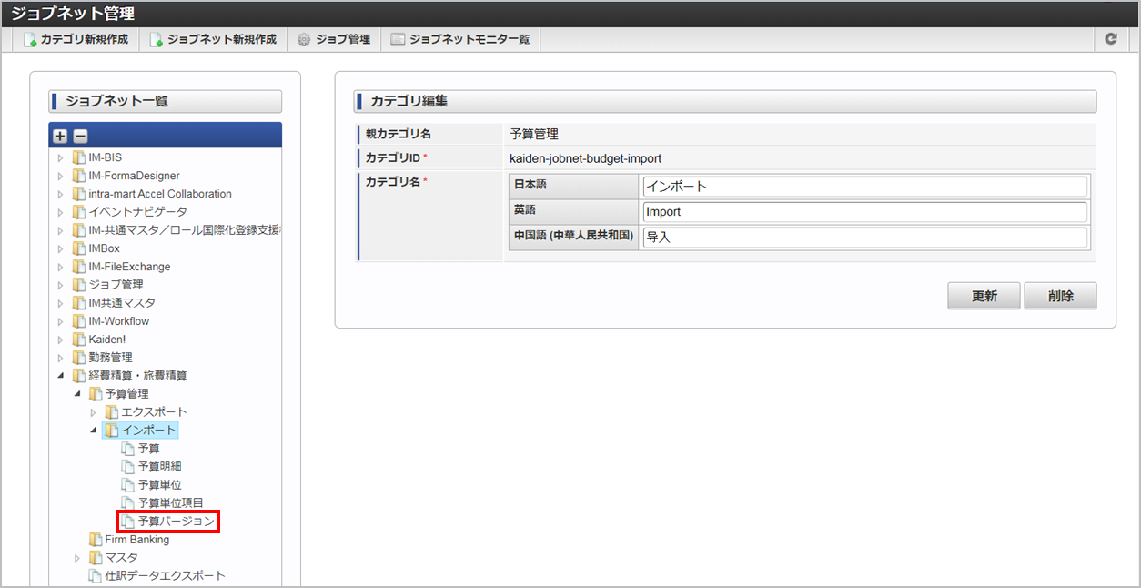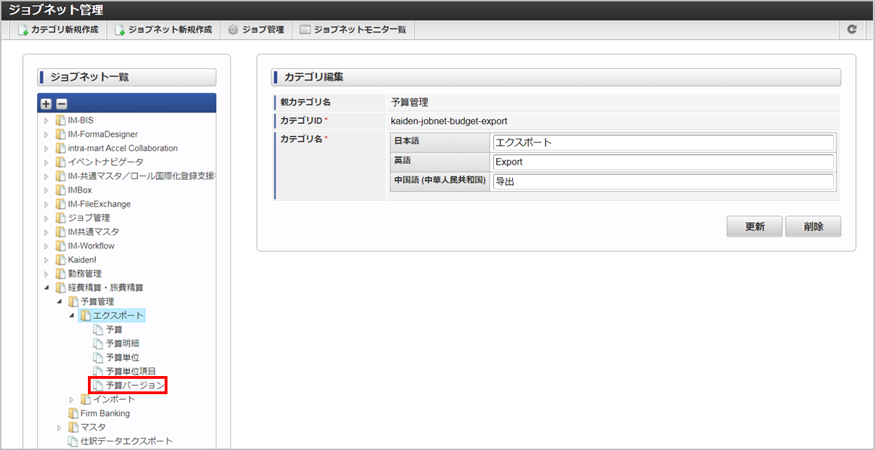 ジョブID ジョブ名(ジョブ選択時のツリー) kaiden-job-budget-export-budgetversion 経費精算・旅費精算 / 予算管理 / エクスポート / 予算バージョン 編集後、「更新」をクリックします。 確認ポップアップの「決定」をクリックします。 ジョブネットが設定されました。
