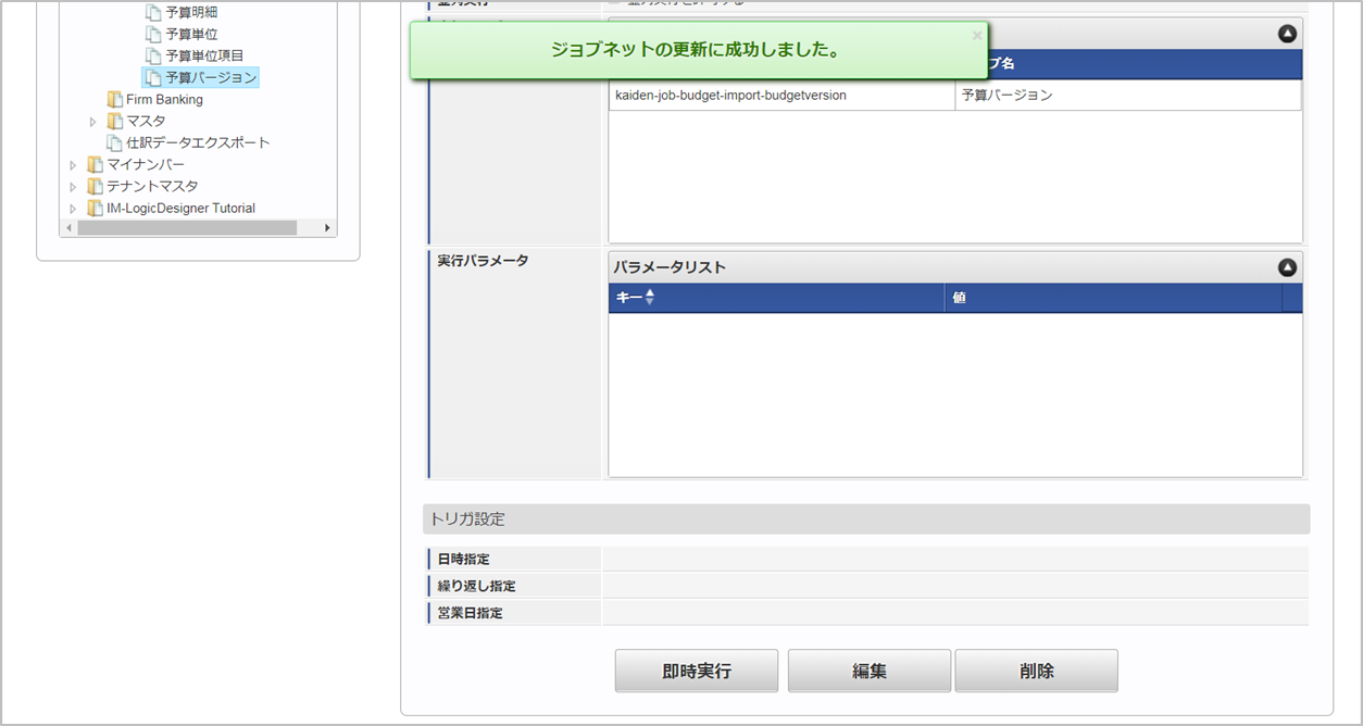 「サイトマップ」→「テナント管理」→「ジョブネット設定」をクリックします。 ジョブネット一覧(画面左部)の「予算バージョン」をクリックします。 「編集」をクリックします。 必要に応じて「実行パラメータ」、「トリガ設定」を編集します。コラム