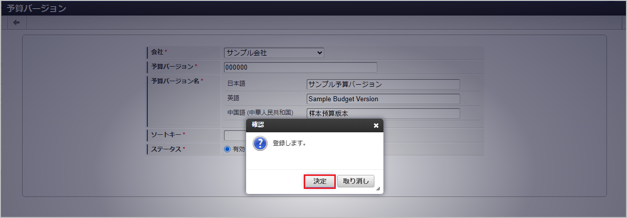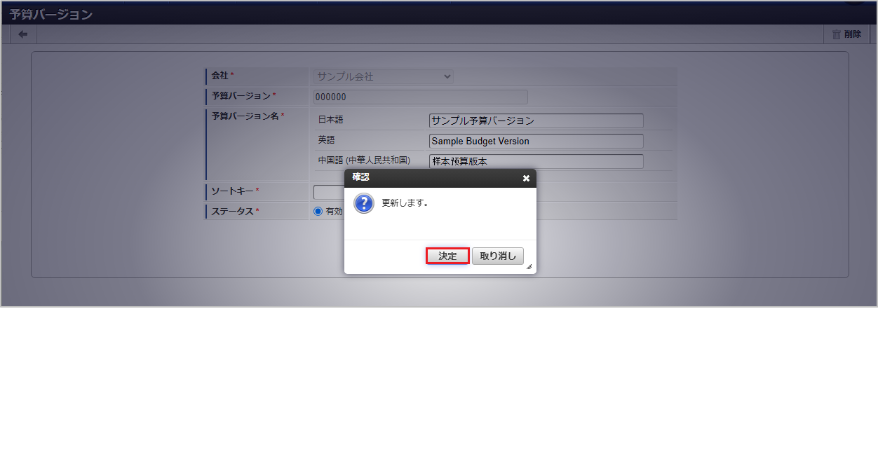 予算バージョンがすでに予算に紐づけされている場合、ステータスの変更および予算バージョンの削除が行えません。 確認ポップアップが表示されますので、「決定」をクリックします。 更新することができました。