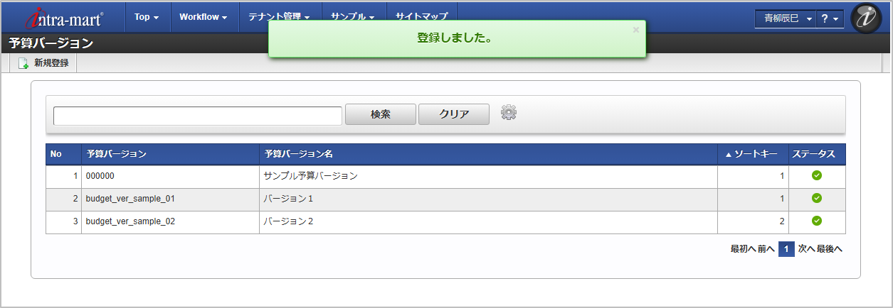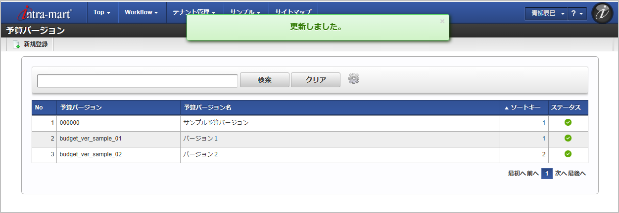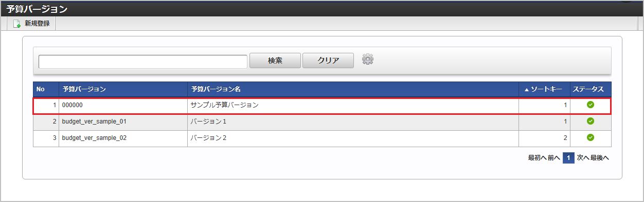 予算バージョン 予算バージョン名 一覧画面の対象データが表示されている行をクリックします。コラム