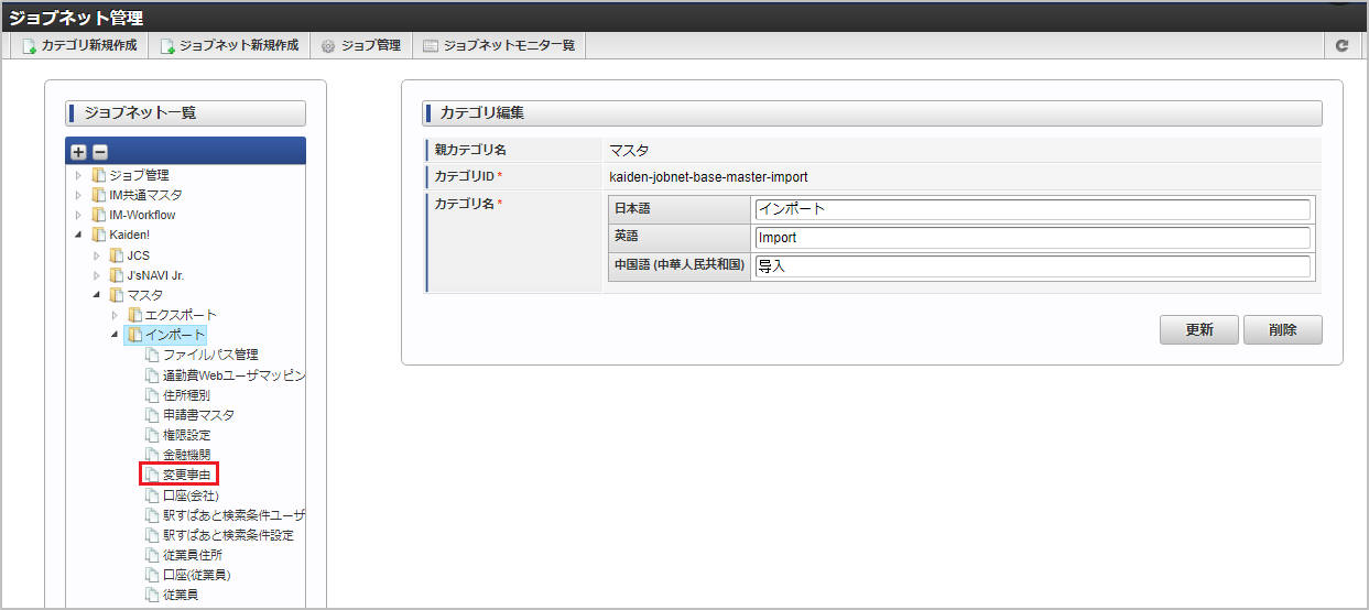 ジョブID ジョブ名(ジョブ選択時のツリー) kaiden-job-master-import-changereason Kaiden! / マスタ / インポート / 変更事由 編集後、「更新」をクリックします。 確認ポップアップの「決定」をクリックします。 ジョブネットが設定されました。コラム