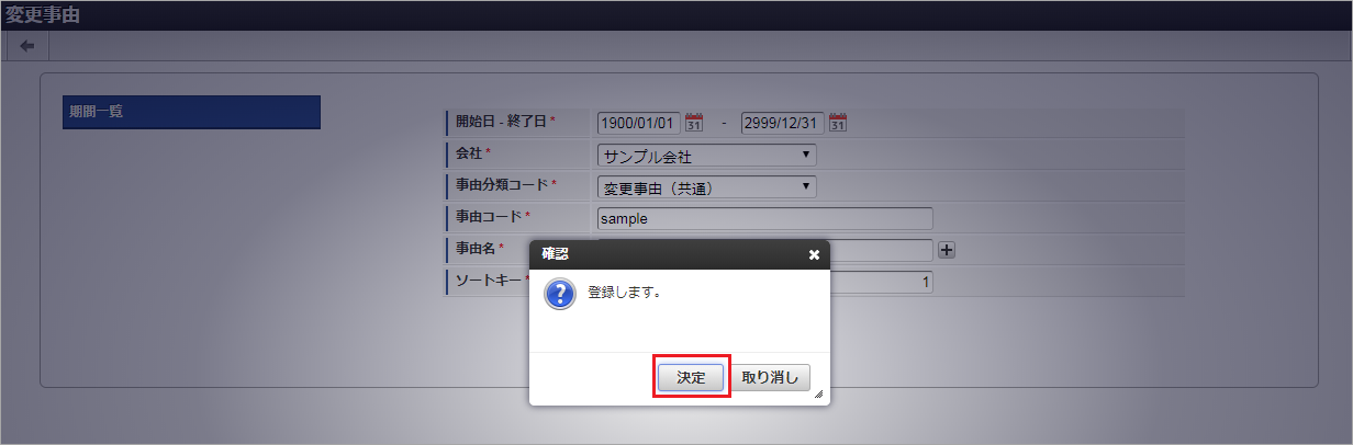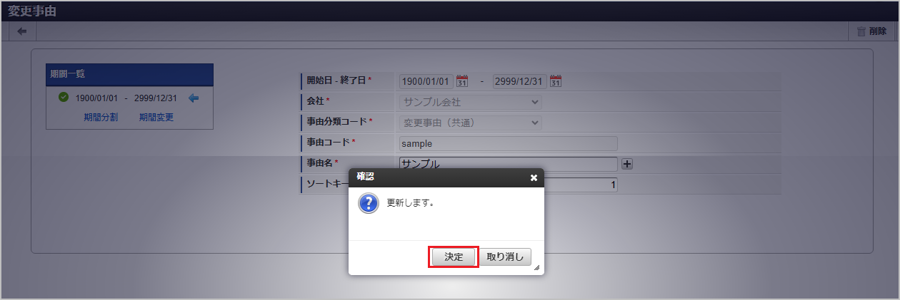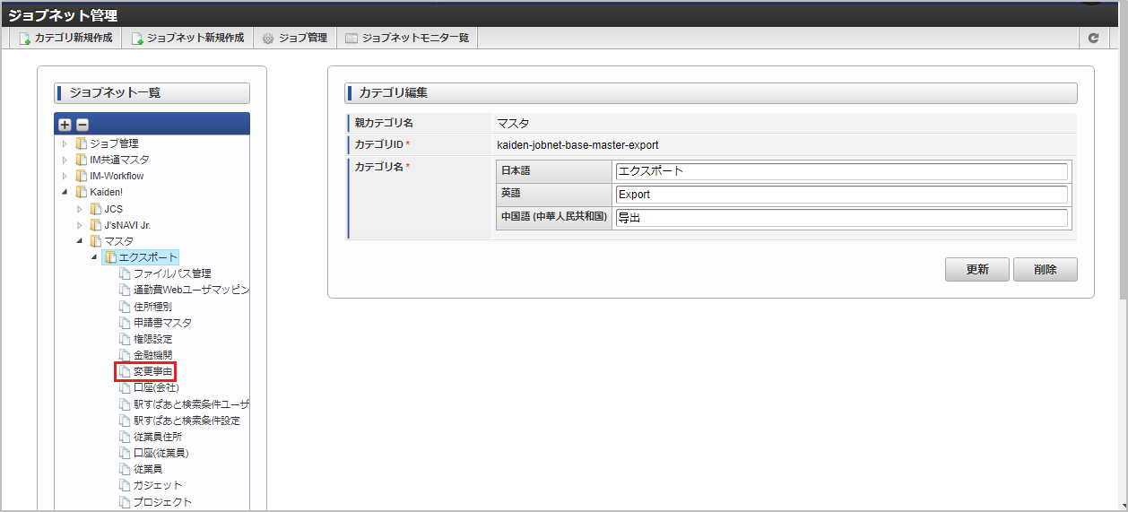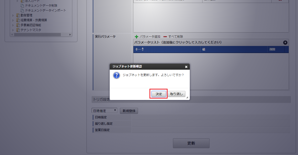 ジョブID ジョブ名(ジョブ選択時のツリー) kaiden-job-master-export-changereason Kaiden! / マスタ / エクスポート / 変更事由 編集後、「更新」をクリックします。 確認ポップアップの「決定」をクリックします。 ジョブネットが設定されました。