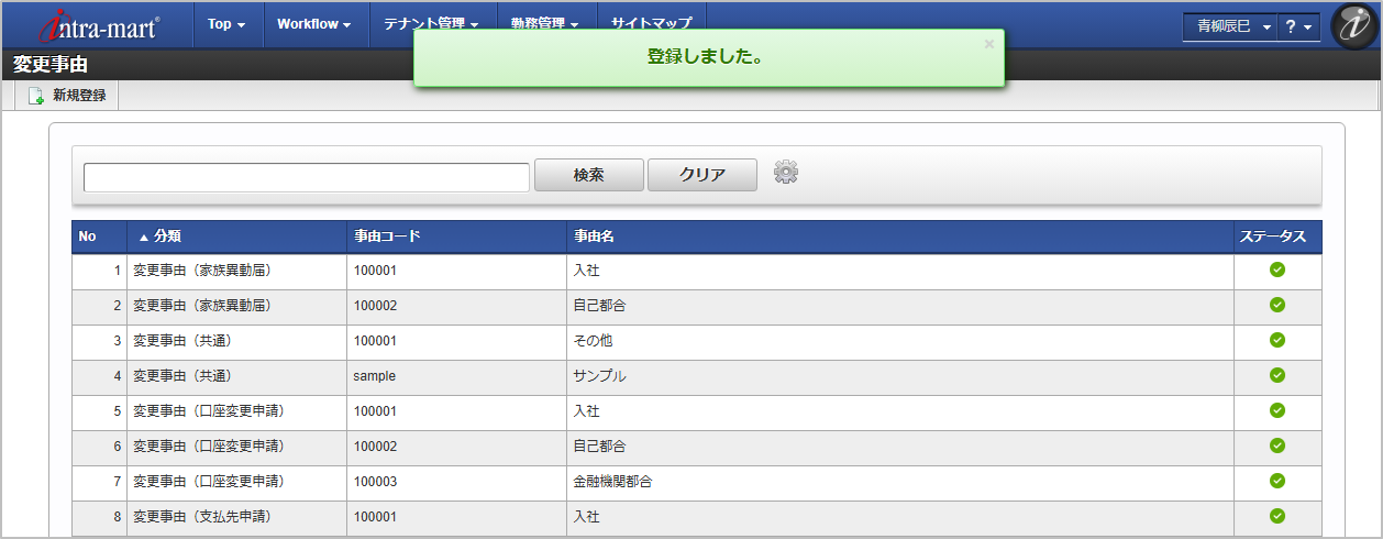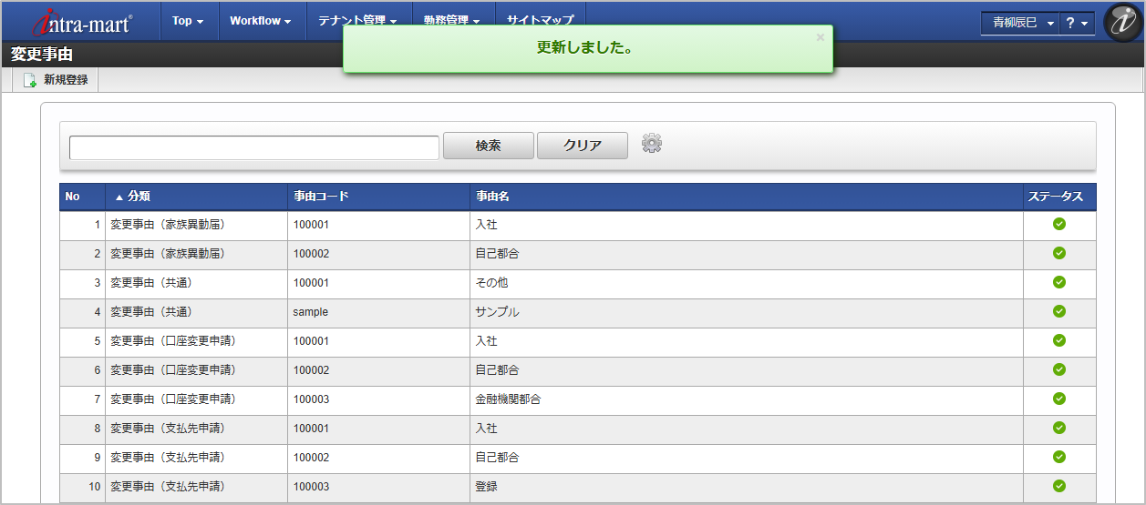 「サイトマップ」→「Kaiden!」→「マスタメンテナンス」→「変更事由」をクリックします。 一覧画面で「検索」をクリックします。コラム