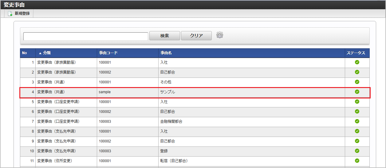 事由コード 事由名 一覧画面の対象データが表示されている行をクリックします。コラム