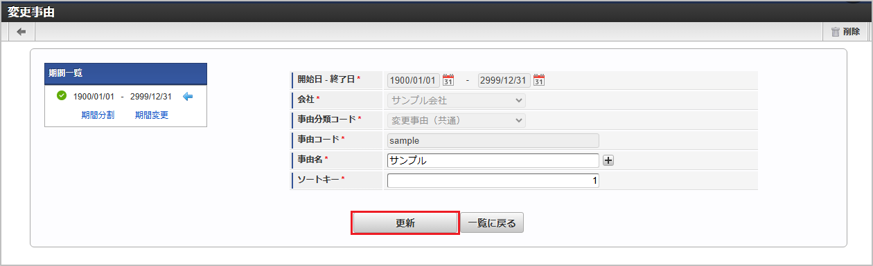 一覧機能の操作方法は、 一覧画面の操作 を参照してください。 登録/更新画面で情報を編集し、「更新」をクリックします。次の項目は編集不可項目です。
