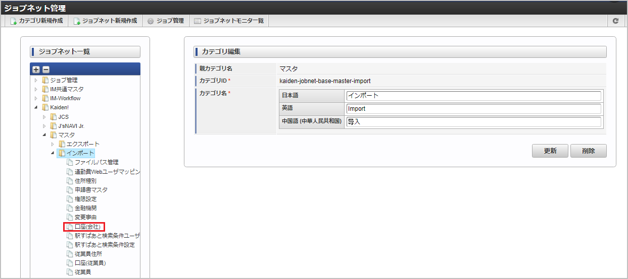 ジョブID ジョブ名(ジョブ選択時のツリー) kaiden-job-master-import-companybank Kaiden! / マスタ / インポート / 口座(会社) 編集後、「更新」をクリックします。 確認ポップアップの「決定」をクリックします。 ジョブネットが設定されました。コラム