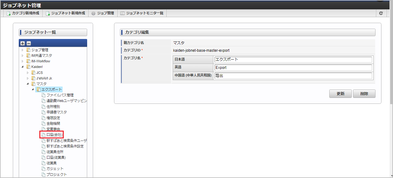 ジョブID ジョブ名(ジョブ選択時のツリー) kaiden-job-master-export-companybank Kaiden! / マスタ / エクスポート / 口座(会社) 編集後、「更新」をクリックします。 確認ポップアップの「決定」をクリックします。 ジョブネットが設定されました。