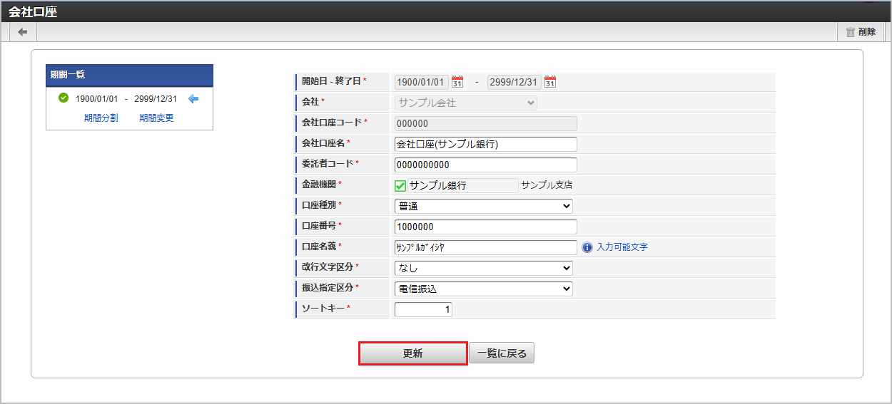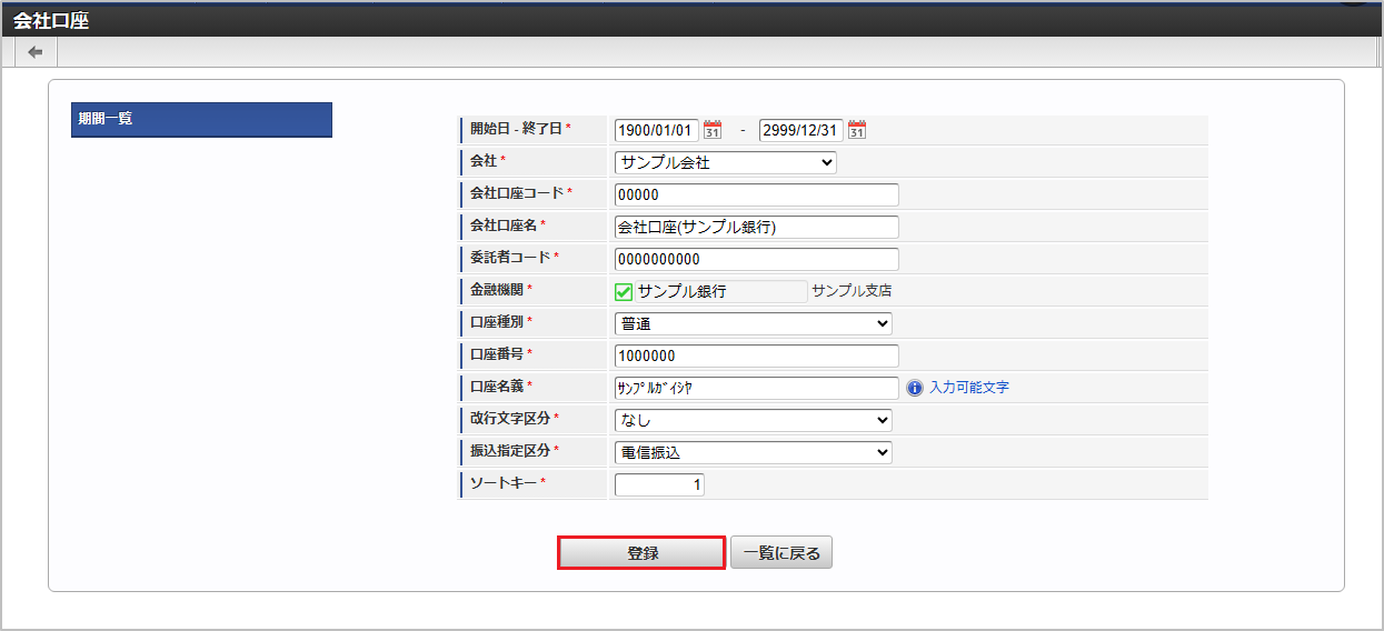 No(列) 項目名 必須 最大文字数 備考 1 会社コード ○ 100 2 会社口座コード ○ 100 3 期間コード 50 未設定の場合、自動的に付与されます。半角英数字、「_」「-」を設定可能です。4 開始日 10 yyyy/MM/dd形式インポートモードが4、5の場合、使用されます。5 終了日 10 yyyy/MM/dd形式インポートモードが4、5の場合、使用されます。6 会社口座名 ○ 250 7 委託者コード ○ 10 8 金融機関コード ○ 4 9 支店番号 ○ 3 10 口座種別 ○ 100 100001-1:普通100001-2:当座100001-9:その他11 口座番号 ○ 7 12 口座名義(カナ) ○ 40 13 改行文字区分 ○ 100 100002-0:なし100002-1:CR100002-2:LF100002-3:CR + LF14 振込指定区分 ○ 100 100003-7:電信振込100003-8:文書振込15 ソートキー ○ 15 16 削除フラグ ○ 1 0:有効1:無効(論理削除)データサンプル"comp_sample_01","bank_account_00","term01","1900/01/01","1999/12/31","会社口座(サンプル銀行)","0000000000","0005","001","100001-1","0000000","サンフ ゚ルガイシヤ","100002-0","100003-7","1","1" "comp_sample_01","bank_account_00","term02","2000/01/01","2999/12/31","会社口座(サンプル銀行)","0000000000","0005","001","100001-1","0000000","サンフ ゚ルガイシヤ","100002-0","100003-7","1","0"コラム