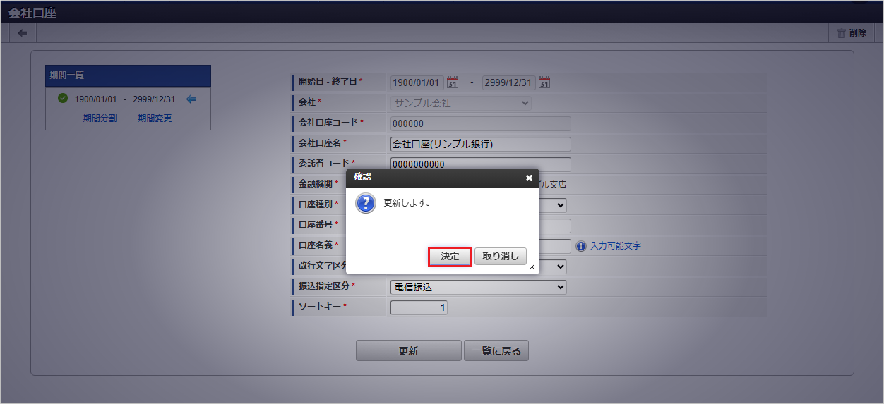 期間機能の操作方法は、 期間の操作 を参照してください。 確認ポップアップが表示されますので、「決定」をクリックします。 更新することができました。