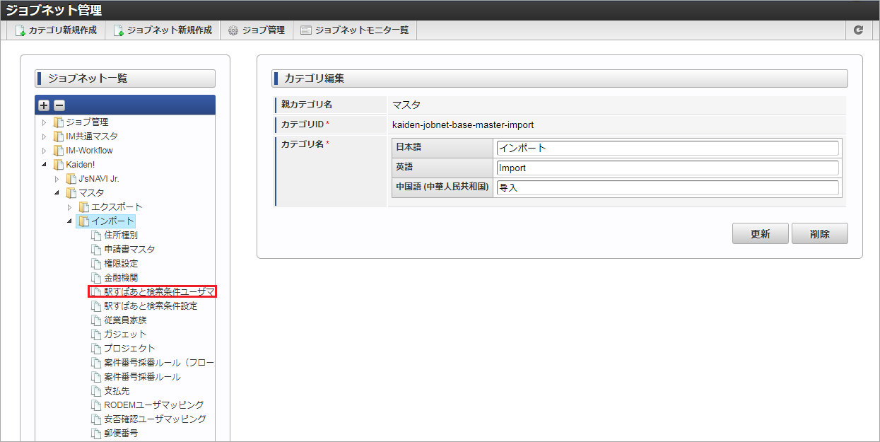ジョブID ジョブ名(ジョブ選択時のツリー) kaiden-job-master-import-ekispertuser Kaiden! / マスタ / インポート / 駅すぱあと検索条件ユーザマッピング 編集後、「更新」をクリックします。 確認ポップアップの「決定」をクリックします。 ジョブネットが設定されました。コラム