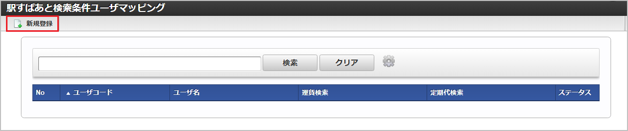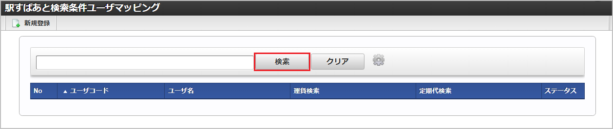 検索欄に検索したい駅すぱあと検索条件ユーザマッピングの以下の項目を入力して「検索」をクリックすると、結果を一覧に表示します。