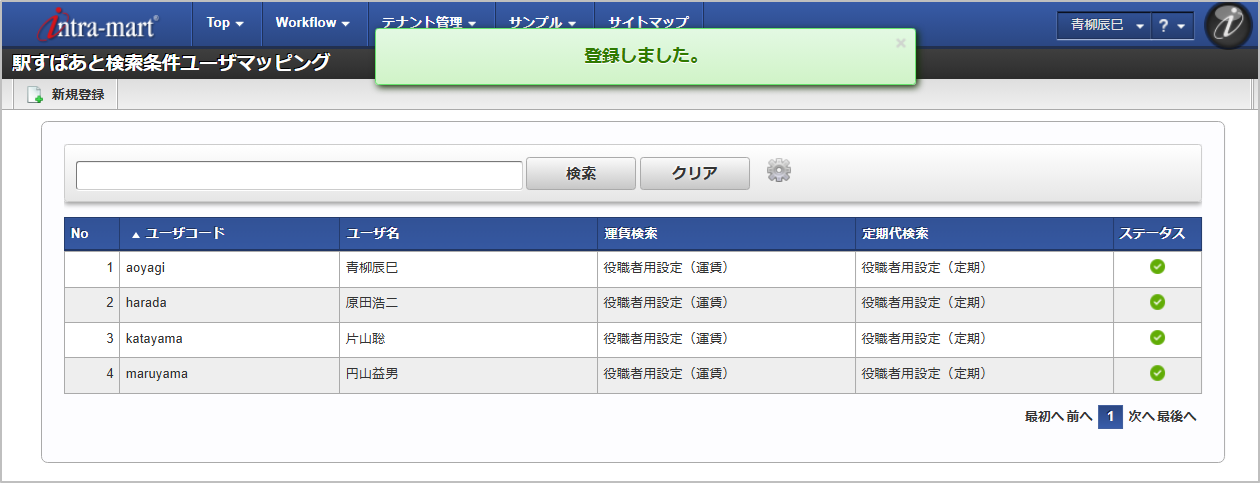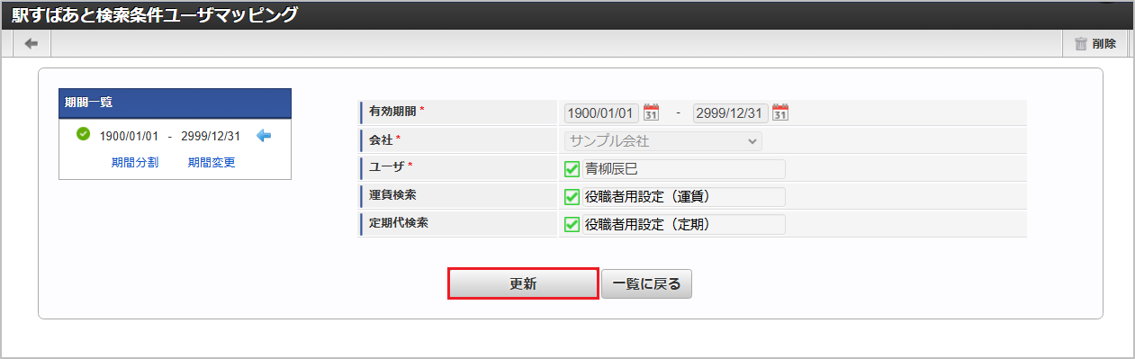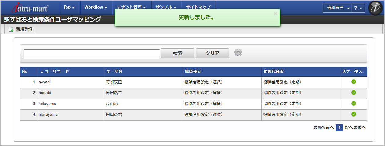 「サイトマップ」→「Kaiden!」→「マスタメンテナンス」→「駅すぱあと検索条件ユーザマッピング」をクリックします。 一覧画面で「検索」をクリックします。コラム