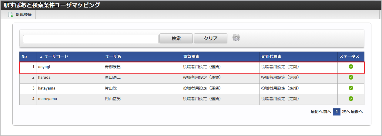 ユーザコード ユーザ名 一覧画面の対象データが表示されている行をクリックします。コラム