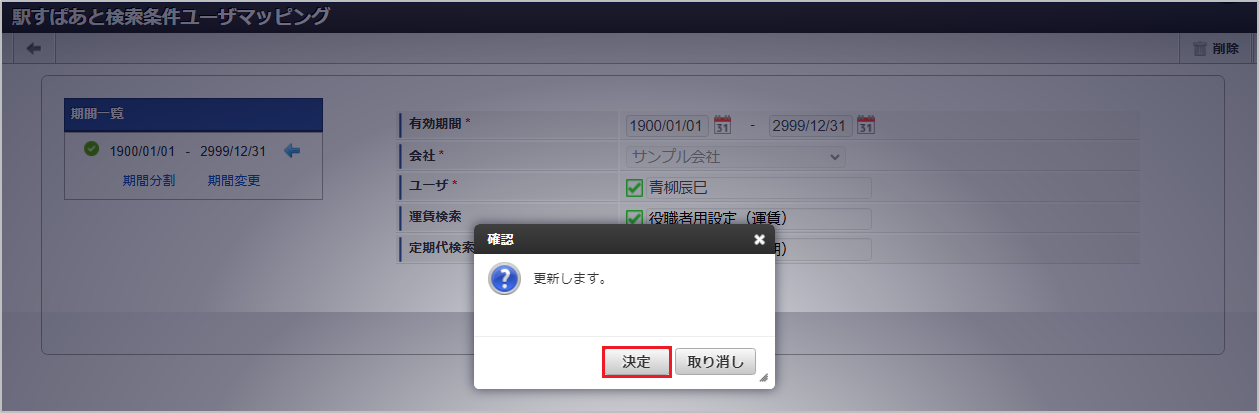 ジョブID ジョブ名(ジョブ選択時のツリー) kaiden-job-master-export-ekispertuser Kaiden! / マスタ / エクスポート / 駅すぱあと検索条件ユーザマッピング 編集後、「更新」をクリックします。 確認ポップアップの「決定」をクリックします。 ジョブネットが設定されました。