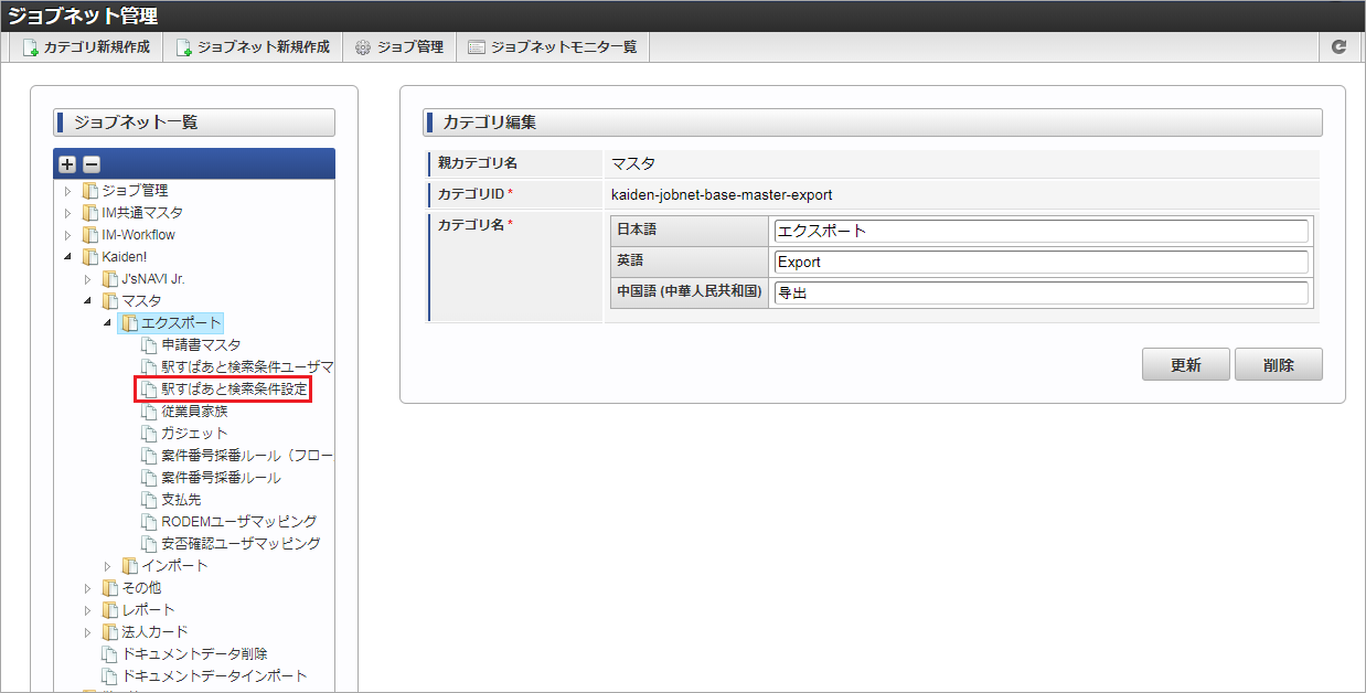ジョブID ジョブ名(ジョブ選択時のツリー) kaiden-job-master-export-ekispertweb Kaiden! / マスタ / エクスポート / 駅すぱあと検索条件設定 編集後、「更新」をクリックします。 確認ポップアップの「決定」をクリックします。 ジョブネットが設定されました。